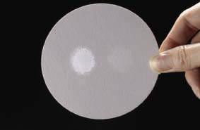左側は、ナノヒアルロン酸はしっかり裏面まで浸透しているが、右側、従来のヒアルロン酸は10分経過しても浸透していない。 |